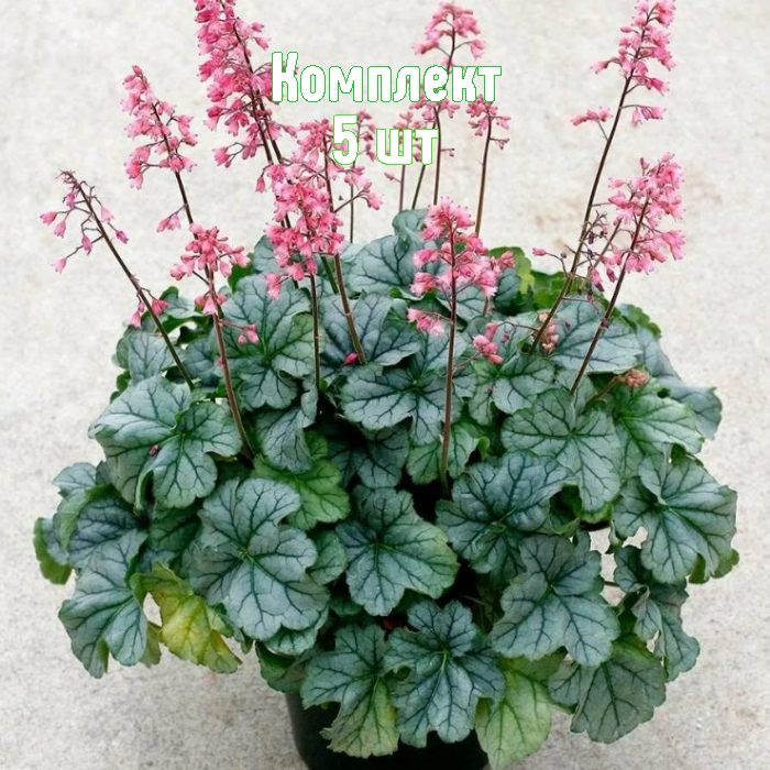 Комплект из пяти саженцев гейхеры зелёно-листной Little Cutie Peppermint — компактные многолетники для создания аккуратных цветовых акцентов. Кустики достигают примерно 20 см в высоту и до 30 см в ширину. Листва округлая, изумрудная с лёгким серебристым отблеском; в летний период (июнь–август) появляются тонкие метёлки с розовыми колокольчиками.