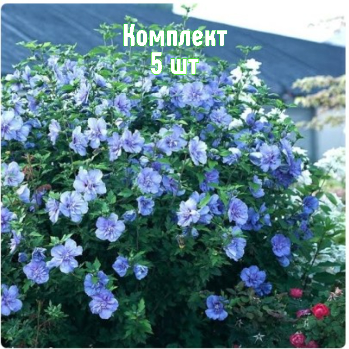 Саженцы гибискуса древовидного Blue Chiffon — набор из 5 растений по акции: 5 по цене 4. Сорт отличается прямыми побегами и крупными махровыми цветками 10–15 см с насыщенно‑синей окраской, ярко‑фиолетовой серединкой и рваными краями. Цветение обильное, раз в год — с июля до конца лета. Растения морозостойкие, быстро формируют декоративный куст и подходят для одиночных посадок и групповых композиций.