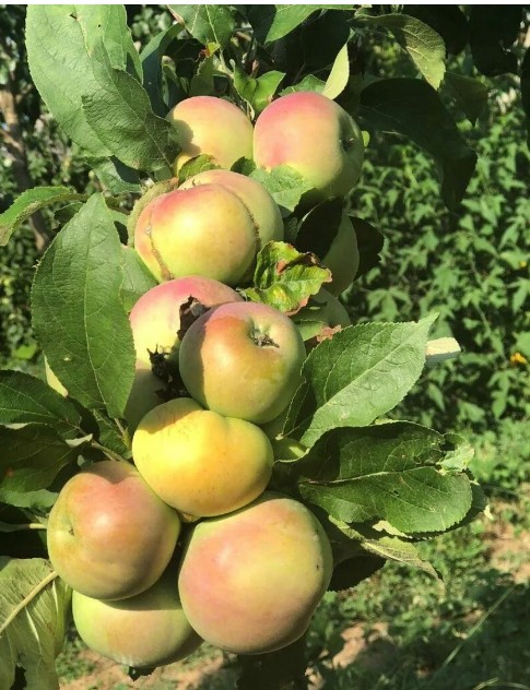 Колоновидная яблоня Каскад — компактный саженец с пирамидальной кроной, тёмно‑зелёной глянцевой листвой и мощными слегка опушёнными побегами. Цветки розоватые, ароматные. Взрослое дерево достигает около 2,5 м, отлично подходит для небольших участков и садов в городе.